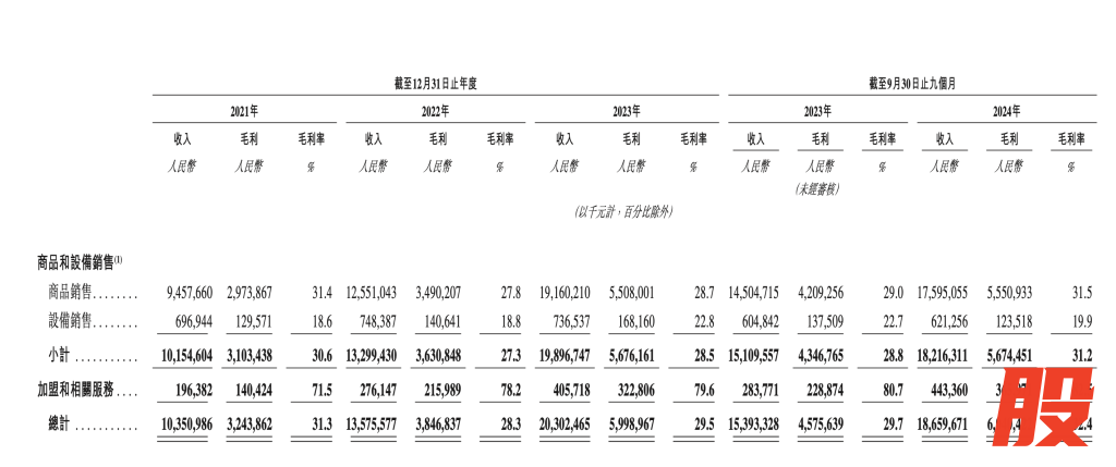 以2024年前三季度为例,商品和设备销售为182.16亿元,加盟和相关服务营收为4.43亿元。